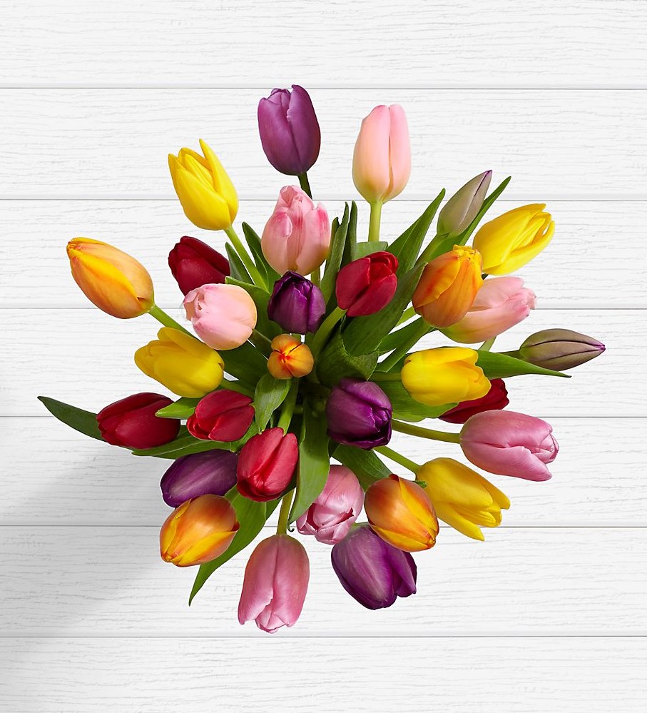 Hand gathered in select floral farms, these kaleidoscope inspired tulips have been dyed so that each petal displays a different vibrant hue of either yellow, blue, green, purple or pink to create a flower arrangement picked fresh for you to get the party started, making it the perfect gift to send in honor of the next birthday or congratulations celebration. BEST bouquet is approximately 21"H x 16"W.