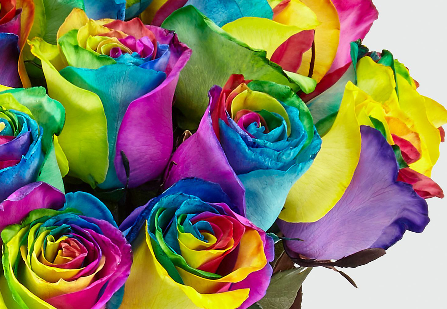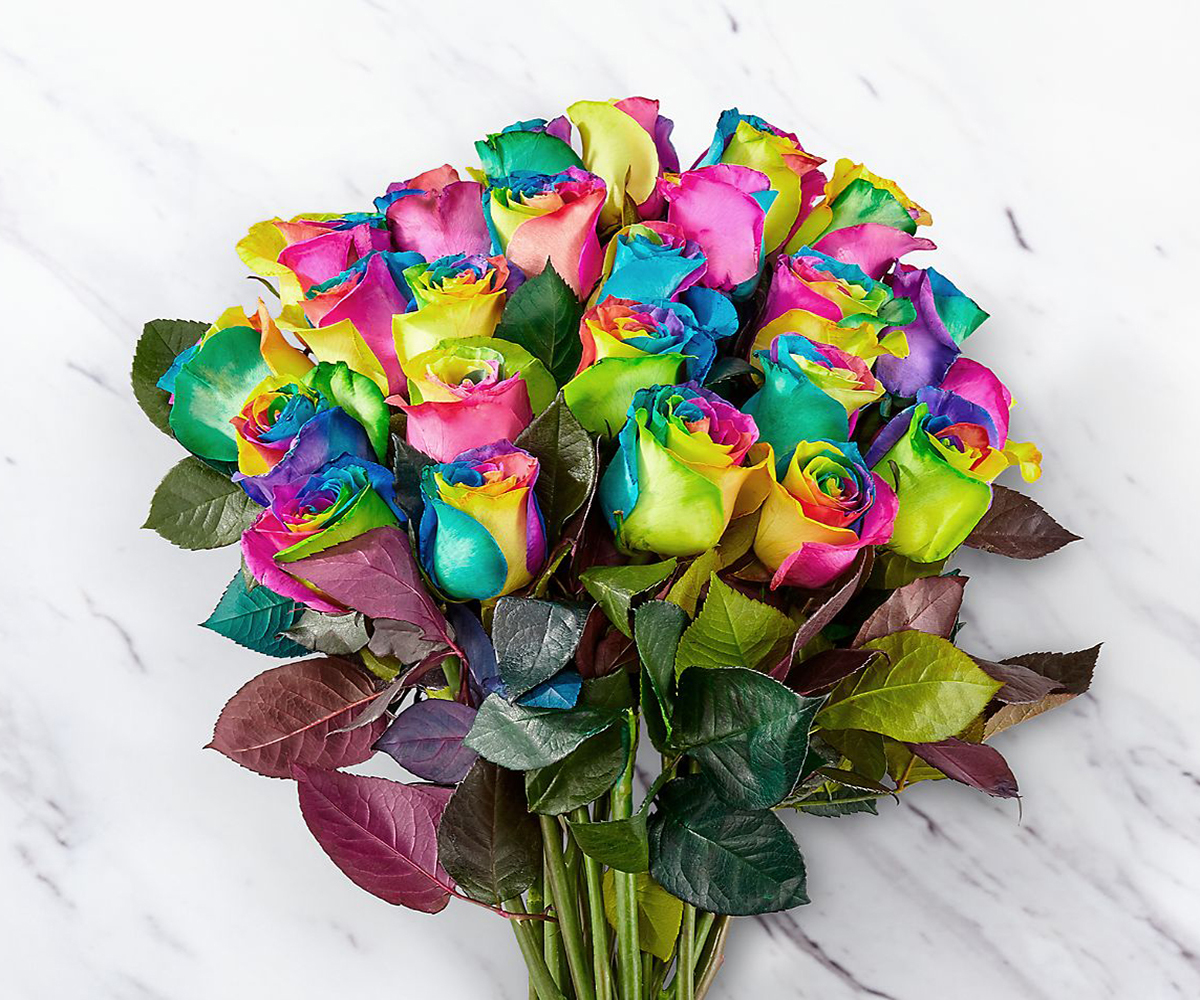 Hand gathered in select floral farms, these kaleidoscope inspired roses have been dyed so that each petal displays a different vibrant hue of either yellow, blue, green, purple or pink to create a flower arrangement picked fresh for you to get the party started, making it the perfect gift to send in honor of the next birthday or congratulations celebration. This bouquet includes multi-colored roses in a purple vase. BEST bouquet is approximately 21"H x 16"W.
