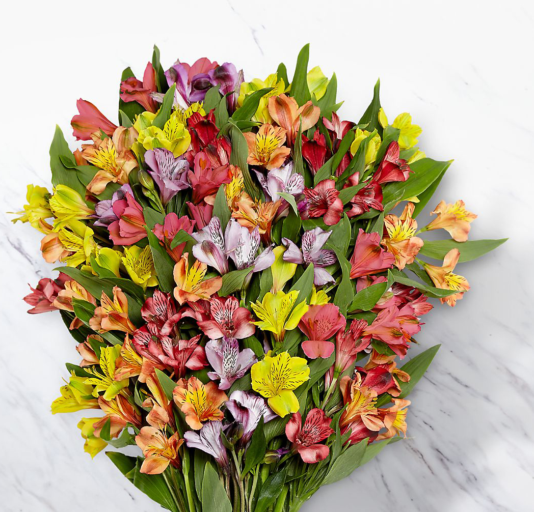 Stargazer lilies stretch their fuchsia petals out amongst an arrangement of blue iris, white traditional daisies, orange mini carnations, purple statice and yellow solidago in a round whitewash handled basket, creating a delightful bouquet your special recipient will adore. BETTER bouquet approximately 16"H x 13"W. Lilies may arrive in various stages of development. The lily blooms will continue to open, extending arrangement life - and your recipient's enjoyment..