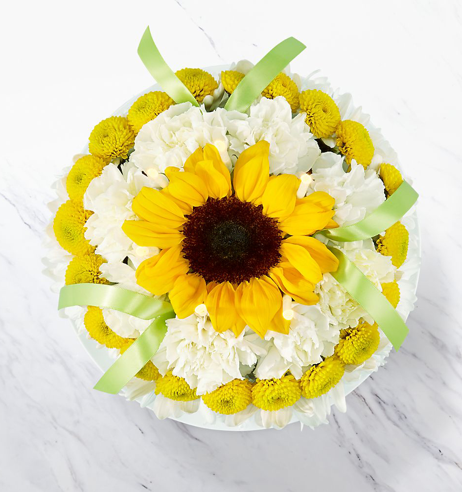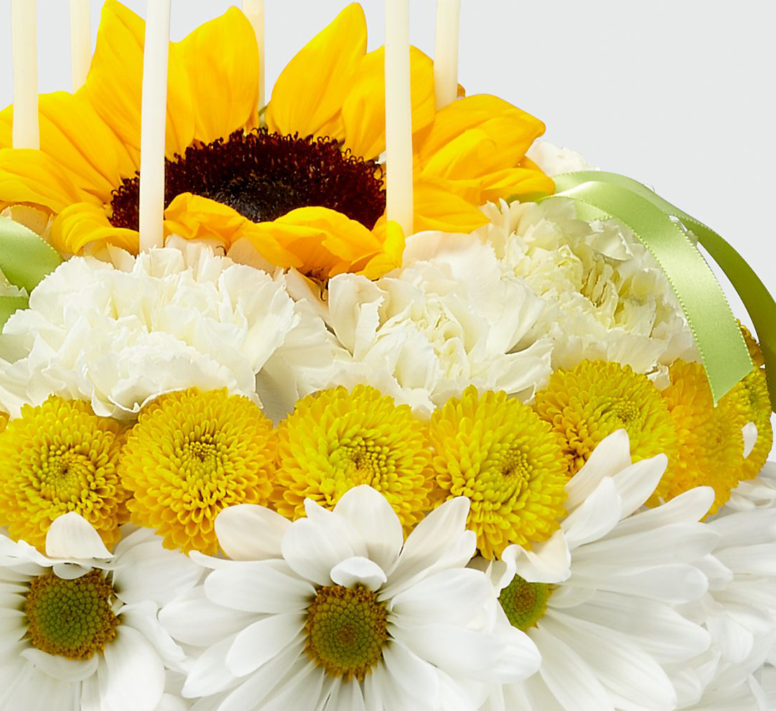 This one-of-a-kind arrangement is frosted with a collection of bright sunflowers, yellow button pompons, white daisy pompons and white carnations. Topped with birthday candles and satin ribbon, this unique gift will bring a smile to their face and make it a truly memorable celebration. - Floral arrangement is approximately 9"H x 9"W